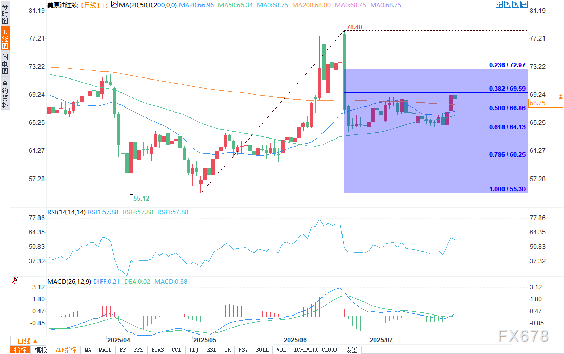 短期关注50%斐波那契回撤位66.86支撑,若守住且MACD红柱持续,价格有望上破69.59阻力;若跌破66.86,则大概率下探64.13支撑。