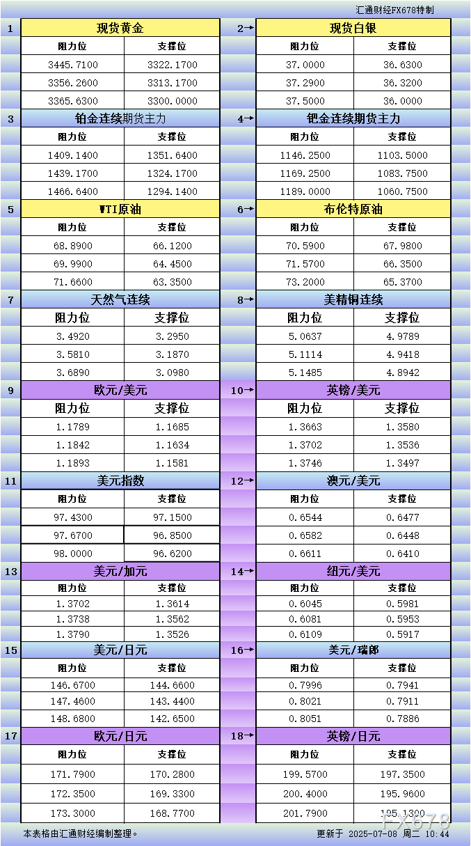 VT外汇官网7月8日亚市更新支撑阻力:18品种支撑阻力(金银铂钯原油天然气铜及十