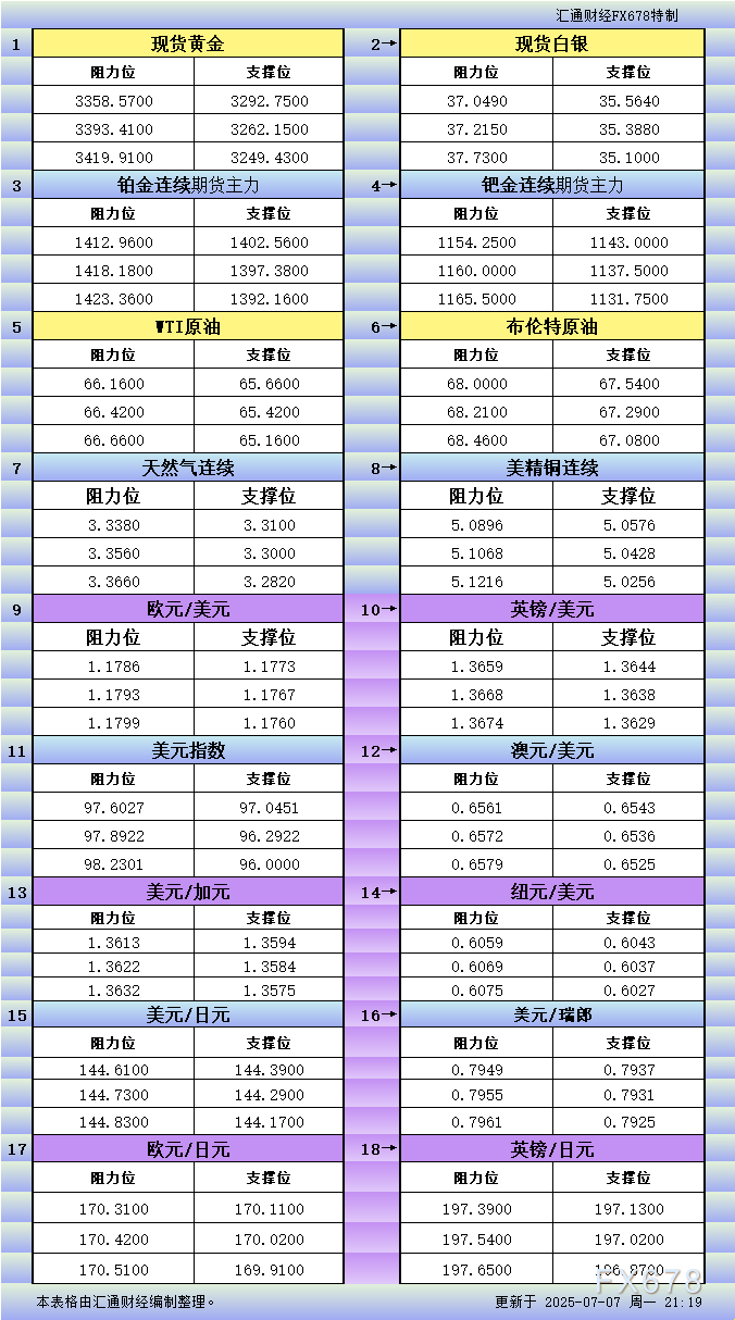 VT外汇官网7月7日美市更新支撑阻力:18品种支撑阻力(金银铂钯原油天然气铜及十