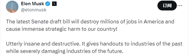 据央视新闻报道,当地时间周六,马斯克在社交媒体平台上发文称,美国参议院关于大规模税收与支出法...